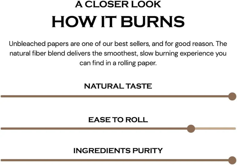 Unbleached papers are crafted from the finest blend of natural fibers and feature a 100% natural gum Arabic glue line to deliver the smoothest smoking experience.